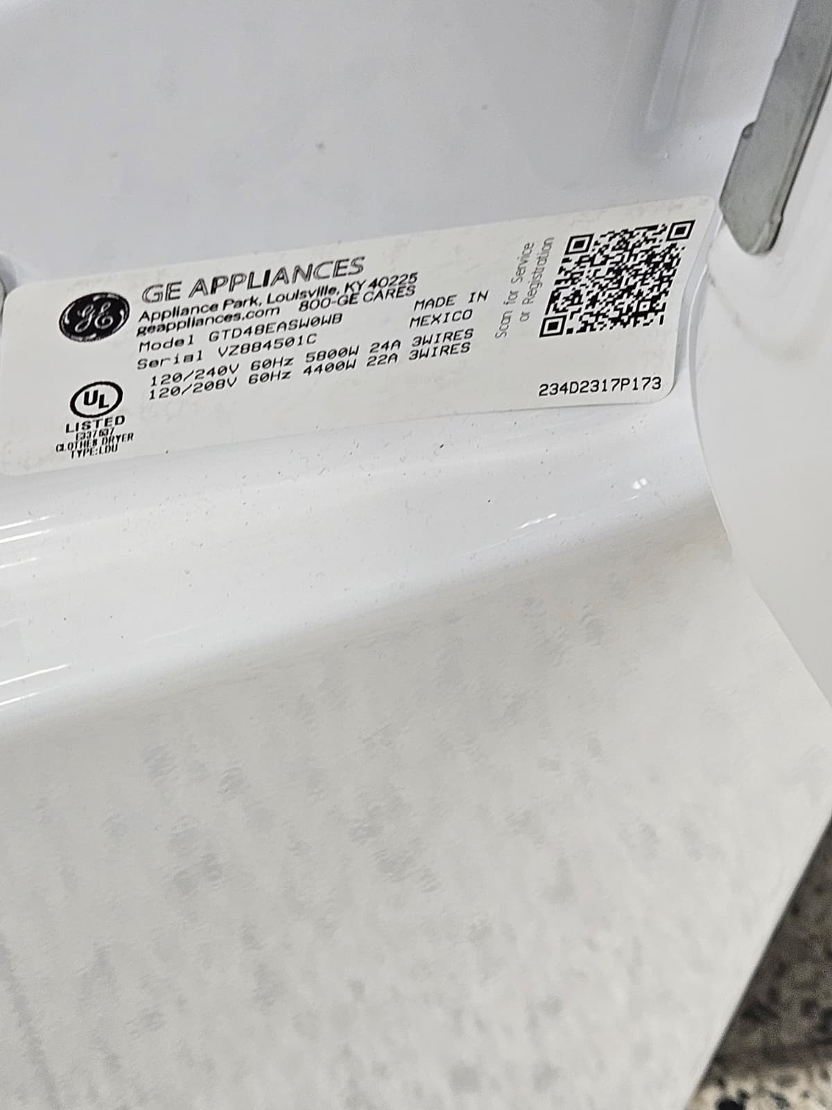 The GE GTD48EASWWB is a spacious 7.2 cu. ft. electric dryer built for efficient, everyday use. It’s ideal for large loads, bedding, and family laundry.