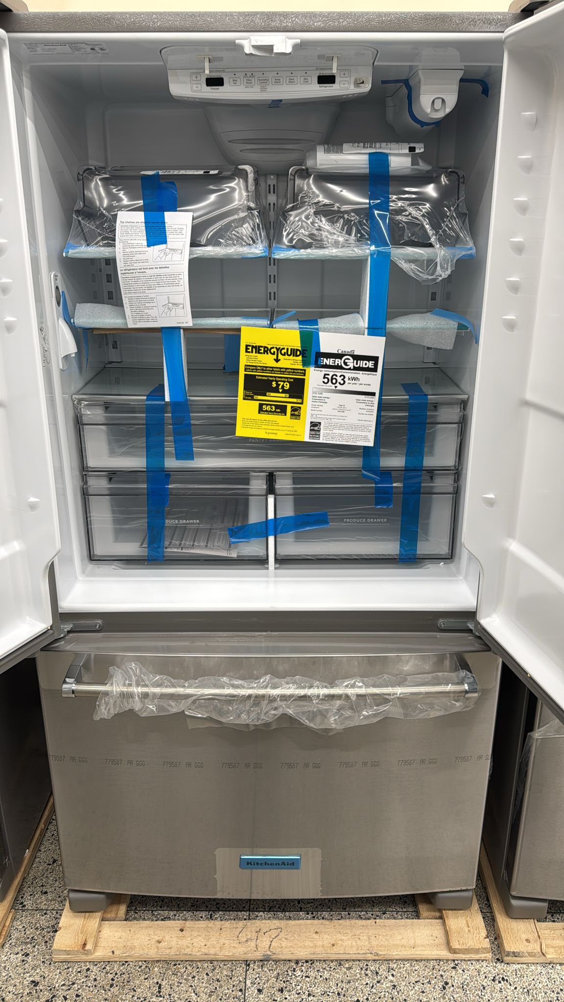 Inside, the French Door layout offers wide shelving and flexible organization. Adjustable shelves and bins allow you to customize the space for everything from tall bottles to large platters. Humidity‑controlled crispers help extend the freshness of fruits and vegetables, while dedicated compartments make it simple to organize dairy, snacks, and beverages.